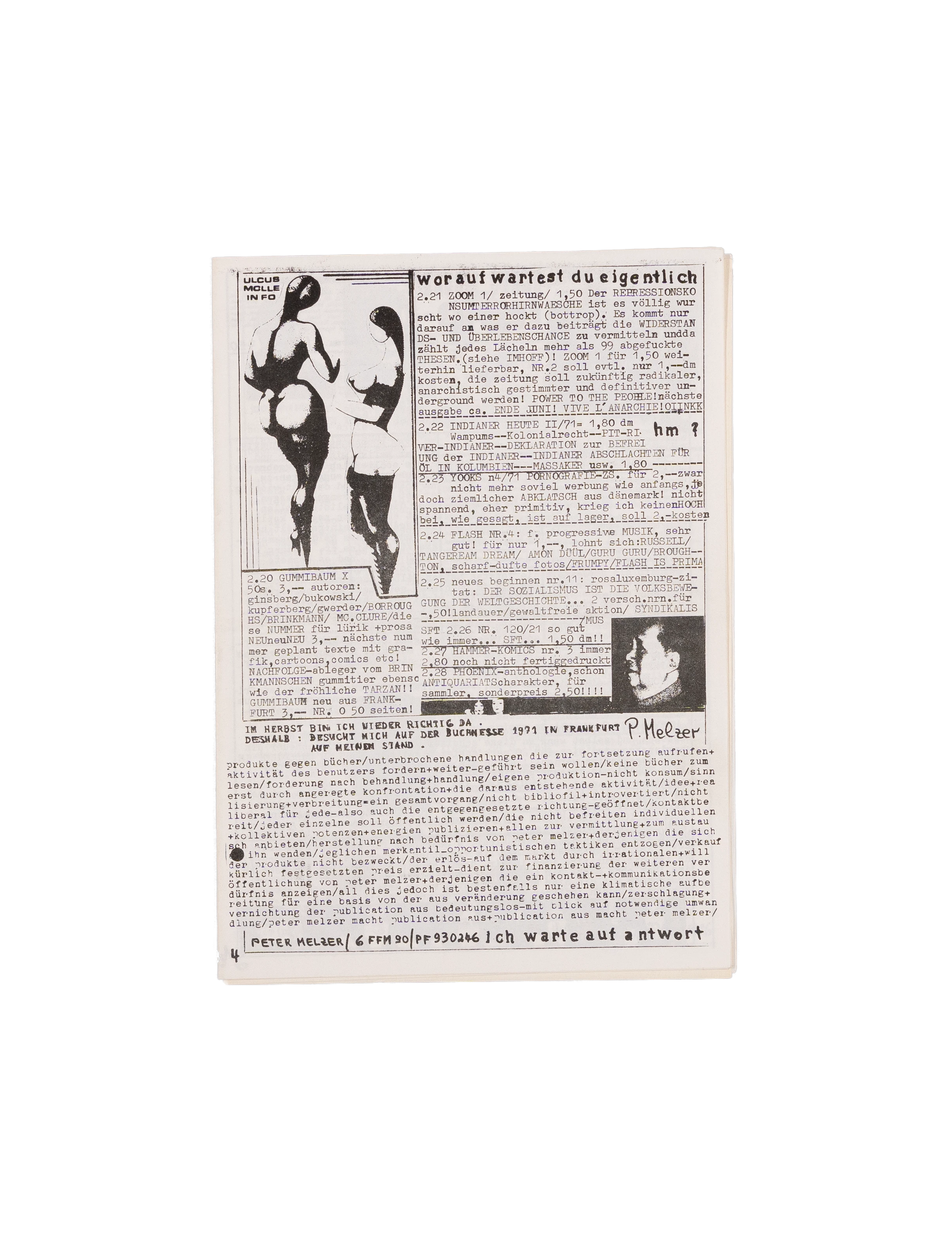 Das Ulcus Molle Info war eine von 1969 bis 1990 von Josef „Biby“ Wintjes (1947-1995) im Rahmen seines Literarischen Informationszentrums herausgegebene Literaturzeitschrift. Inspiriert durch die amerikanische Beat-Generation schrieb Wintjes früher selbst Gedichte und bekam so Kontakt mit der deutschsprachigen Untergrundliteratur der 1960er Jahre, was ihn in seiner Motivation eine Informations- und Kommunikationszeitschrift zu gründen, bestärkte. „Ulcus Molle Info“ erschien anfangs monatlich, ab Nr. 4/5-1972 zweimonatlich und zuletzt ab 1987 vierteljährlich. Es verstand sich als Öffentlichkeits- und Publikationshilfe für junge Autoren und Kleinverlage. Die Zeitschrift wurde zu einem wichtigen Diskussionsforum der literarischen, spirituellen und politischen Gegenkultur.