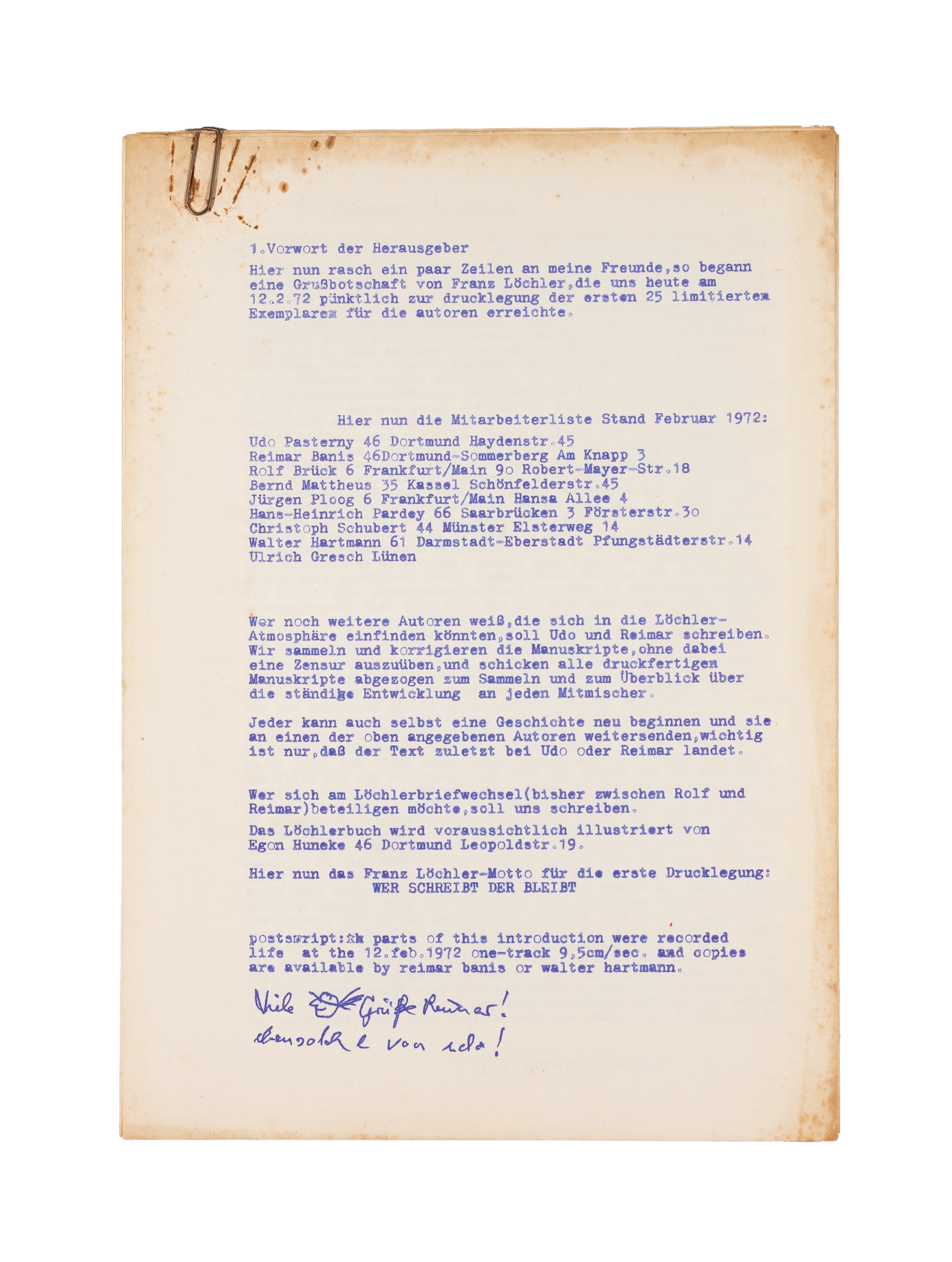 070_01 Franz Löchler-Motto, v. a. Udo Pasterny Ort Kiste 7 URL https://aip.hfk-bremen.de/archive/070-01 Editor Franz Löchler-Motto, Udo Pasterny Jahr 1972 Filter Zettel