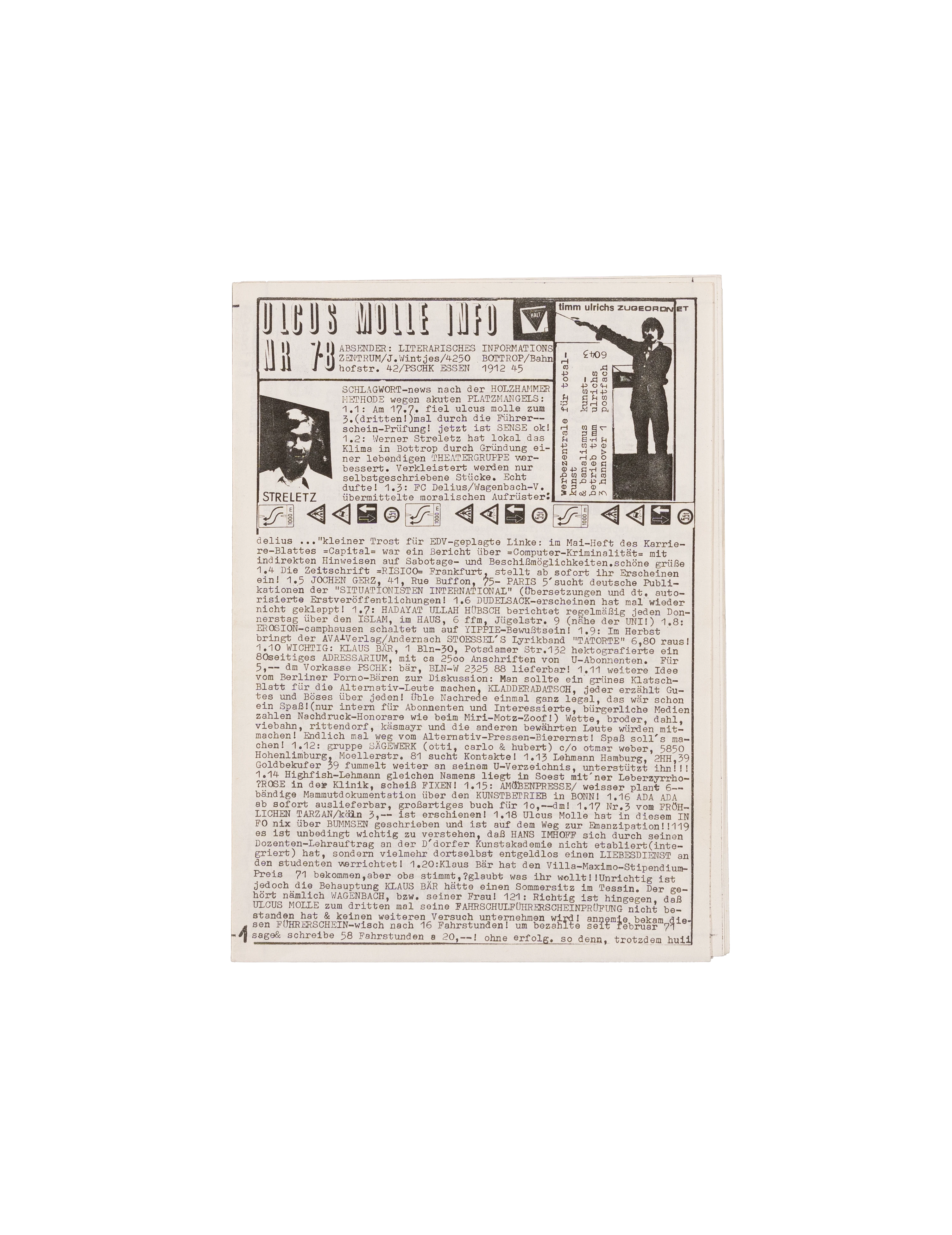 Das Ulcus Molle Info war eine von 1969 bis 1990 von Josef „Biby“ Wintjes (1947-1995) im Rahmen seines Literarischen Informationszentrums herausgegebene Literaturzeitschrift. Inspiriert durch die amerikanische Beat-Generation schrieb Wintjes früher selbst Gedichte und bekam so Kontakt mit der deutschsprachigen Untergrundliteratur der 1960er Jahre, was ihn in seiner Motivation eine Informations- und Kommunikationszeitschrift zu gründen, bestärkte. „Ulcus Molle Info“ erschien anfangs monatlich, ab Nr. 4/5-1972 zweimonatlich und zuletzt ab 1987 vierteljährlich. Es verstand sich als Öffentlichkeits- und Publikationshilfe für junge Autoren und Kleinverlage. Die Zeitschrift wurde zu einem wichtigen Diskussionsforum der literarischen, spirituellen und politischen Gegenkultur. Der Name der Zeitschrift leitet sich von der Geschlechtskrankheit „Ulcus molle“ ab, auch als „Weicher Schanker“ bekannt."